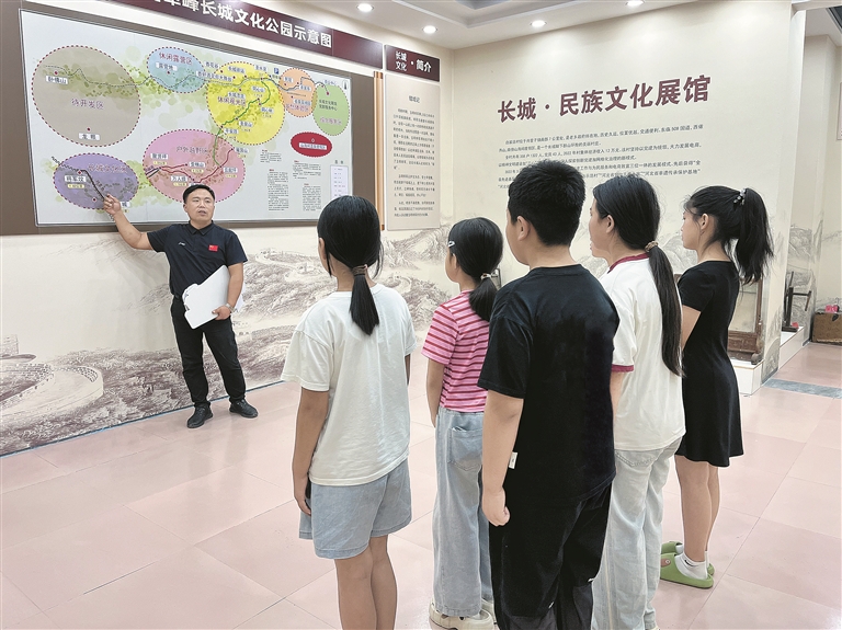 在长城文化展馆,朱岳峰为来自迁安的小游客讲解。